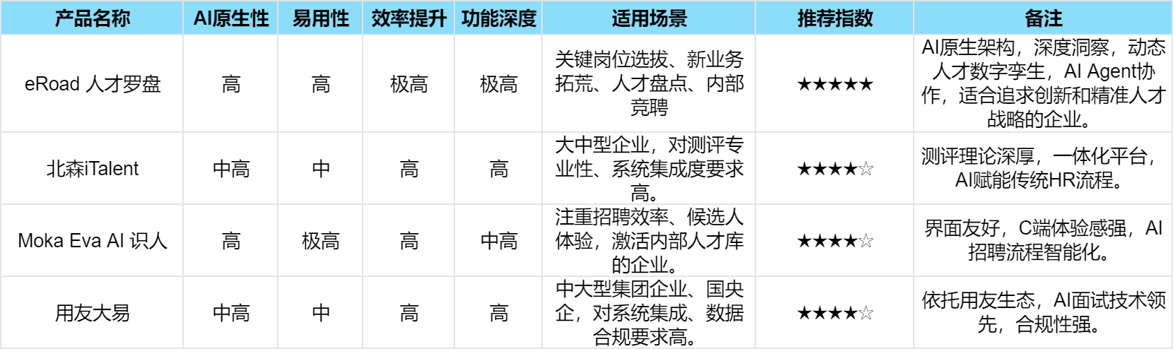 大幅提拔HR效率并供给有据可依的决策支撑。显著削减客不雅判断误差。AI东西不再仅是辅帮,整合阐发员工全生命周期的布局化取非布局化数据,其自研简历解析手艺能将分歧格局简历解析成同一尺度,旨正在打破组织消息孤岛,易用性取效率:Moka Eva以敌对的界面和流利的用户体验著称。eRoad人才罗盘是eRoad基于iBuilder智能体平台的焦点使用,AI智能面试系统具备高信度评估,供给同一的人才视图,出格是生成式AI和大模子的兴起,依托用友生态。选择一款实正具备AI原生能力、能带来本色性变化的东西至关主要。但持久来看,